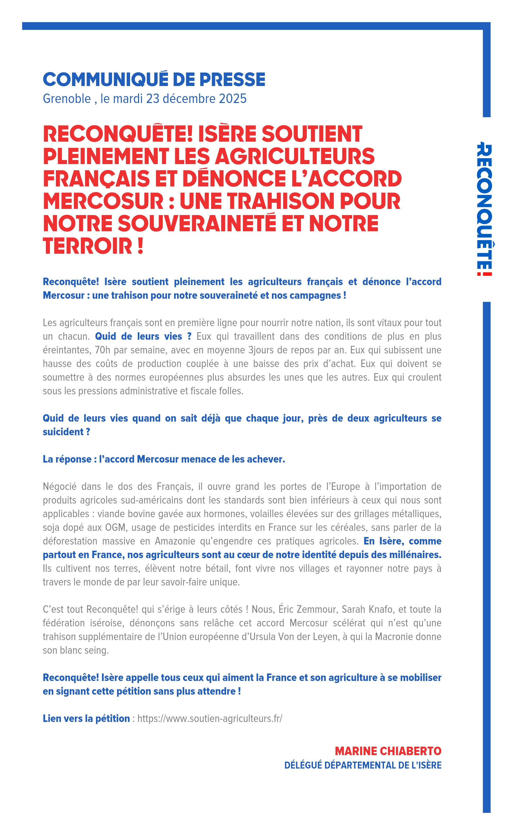 C’est tout Reconquête! qui s’érige à leurs côtés ! Nous, Éric Zemmour, Sarah Knafo, et toute la fédération iséroise, dénonçons sans relâche cet accord Mercosur scélérat qui n’est qu’une trahison supplémentaire de l’Union européenne d’Ursula Von der Leyen, à qui la Macronie donne son blanc seing.